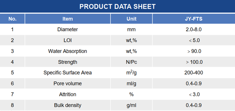 JY-FTS type products have the characteristics of high compressive strength and low abrasion. It can be adjusted by size, pore structure, and bulk density according to requirements. It is widely used for adsorbent, hydrodesulfurization catalyst carrier, hydrodenitrogenation catalyst carrier, and CO sulfur tolerant shift catalyst carrier and other fields.